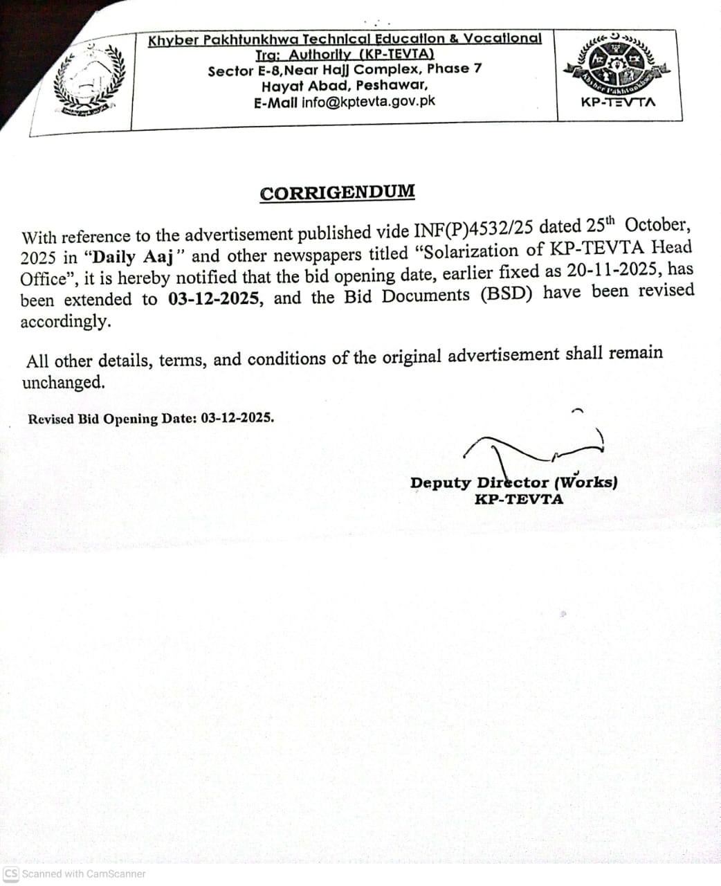 Corrigendum – Solarization of KP-TEVTA Head Office